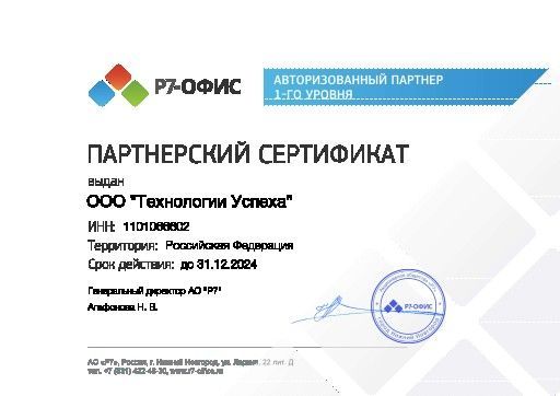 Компания «Технологии успеха» - авторизованный партнер АО «Р7».  Сертифицированные специалисты подберут оптимальное решение для вашей компании, окажут помощь по установке и настройке программного обеспечения. Получите консультацию и узнайте о возможности проведения пилотного проекта  по телефону 8 (8212) 28-47-04  или оставьте заявку и мы свяжемся с вами.